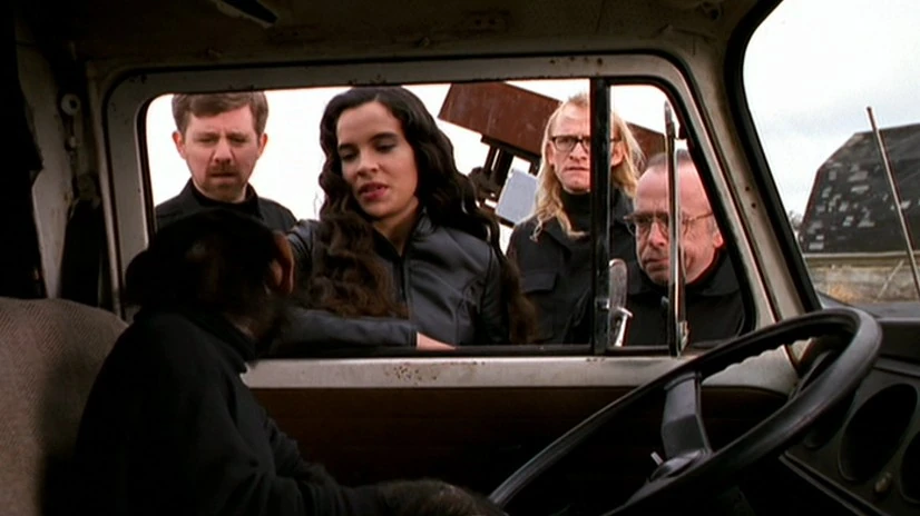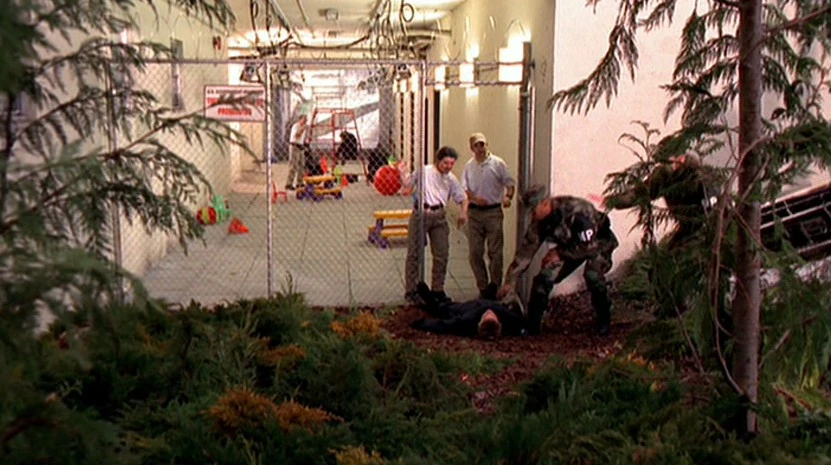 The four Lone Gunmen and Yves Adele Harlow watch the Boulle Behavioral Laboratory with binoculars as they discuss the situation. When people walk out into the chainlink enclosure, they suspect that Peanuts is among them but soon after chimpanzees start barreling out for playtime. Frohike, Byers, and Langly discuss how they have been had while Harlow remains silent and Jimmy Bond notices a chimpanzee waiting at the gate just like the message had told them. He puts forward the crazy idea that the chimpanzee is Peanuts since it is waving them over, and while they ridicule it, Jimmy points out how Yves isn’t attacking the idea.