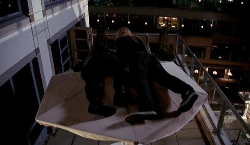 When the French man and his thugs arrive on the balcony they find a rope made of towels and sheets going down to the street. They leave while Frohike and Langly watch them from atop the patio table’s umbrella, which promptly falls over after the thugs have gone.