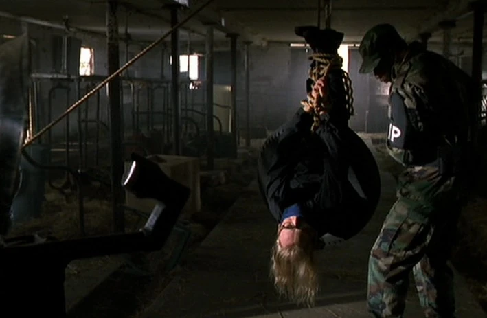 Following the trail of the ransom demand, Military police storm the barn moments after a package was picked up, finding Langly hanging upside down. They pull the cloth away from his mouth.