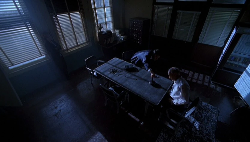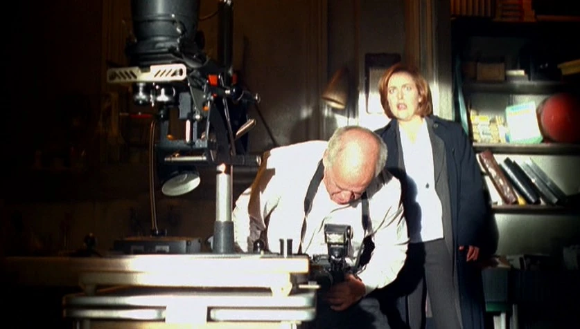 Then he notices that Scully is gray, and says, "You're very lucky." Seeing the look on his face, Scully demands to know if he thinks she is about to die; when he turns on his camera, she demands that he turn it off, but he says Death is coming. A bright light suddenly shines into the darkroom. Fellig takes a photo just as Ritter enters and shoots. The bullet passes right through the camera and through Fellig into Scully, who collapses.